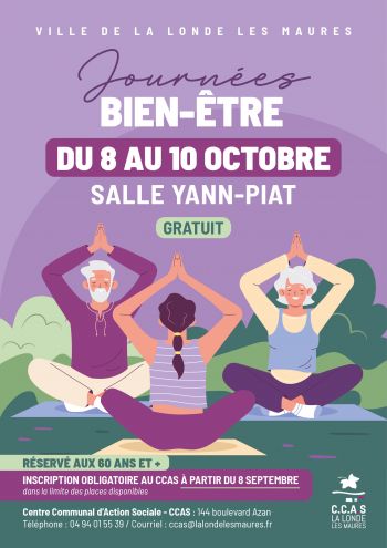 Dans le cadre d'Octobre Bleu, le CCAS de la Ville de La Londe Les Maures organise ses Journées Bien-Être. Prévue le jeudi 9 et vendredi 10 octobre, le CCAS a décidé, devant la demande, d'ajouter le mercredi 8 octobre au programme.