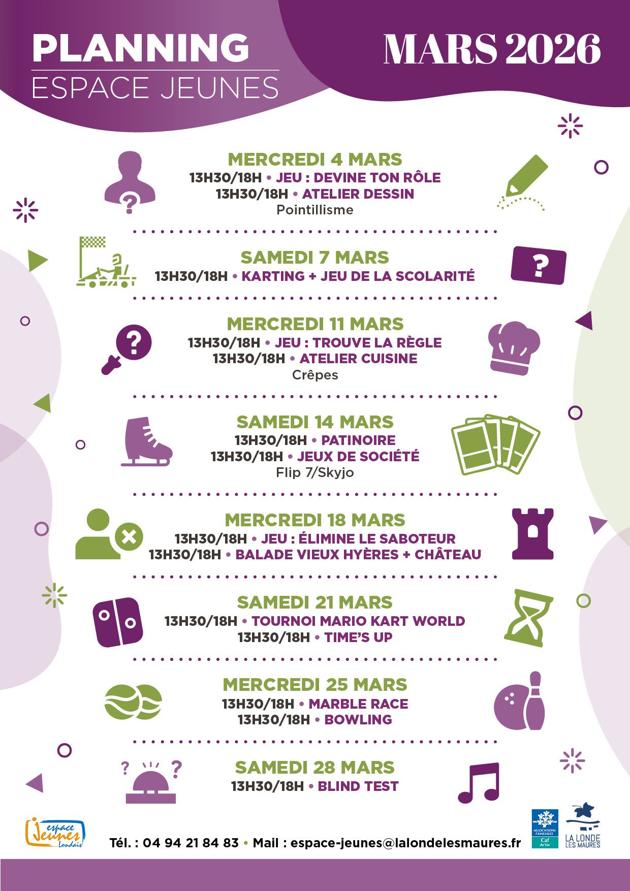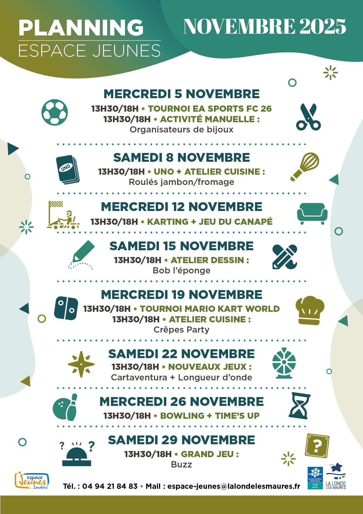 L'Espace Jeunes est un accueil de loisirs habilité par Jeunesse et Sports. Il propose, tout au long de l'année, des animations ludiques, éducatives, culturelles et sportives. Les adolescents, agés de 12 à 17 ans, s'épanouissent et se détendent dans un cadre rassurant. L'équipe d'encadrement veille au respect des règles de sécurité physique et psychologique. À chaque période, un programme est proposé, consultable sur place ou sur le site de la Ville. Ce programme est élaboré en concertation avec les jeunes adolescents. Pour les activités payantes, la participation des familles dépendra du quotient familial. Un pourcentage du coût réel du prestataire sera appliqué.